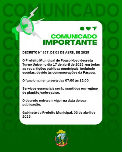 DECRETADO TURNO ÚNICO NA PREFEITURA MUNICIPAL DIA 17 DE ABRIL DE 2025.